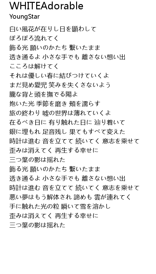| [05:08.36] | 歪みは消えてく 再生する幸せに 三つ葉の影は摇れた |