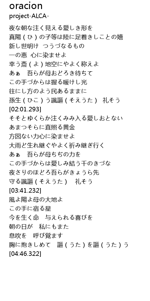 | [04:34.380] | 胸に抱きしめて 謳(うた)を謳(うた)う |