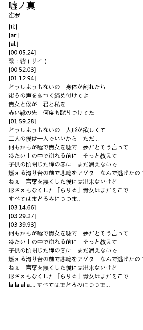 | [04:27.65] | 形さえもなくした「らりる」貴女はまだそこで |