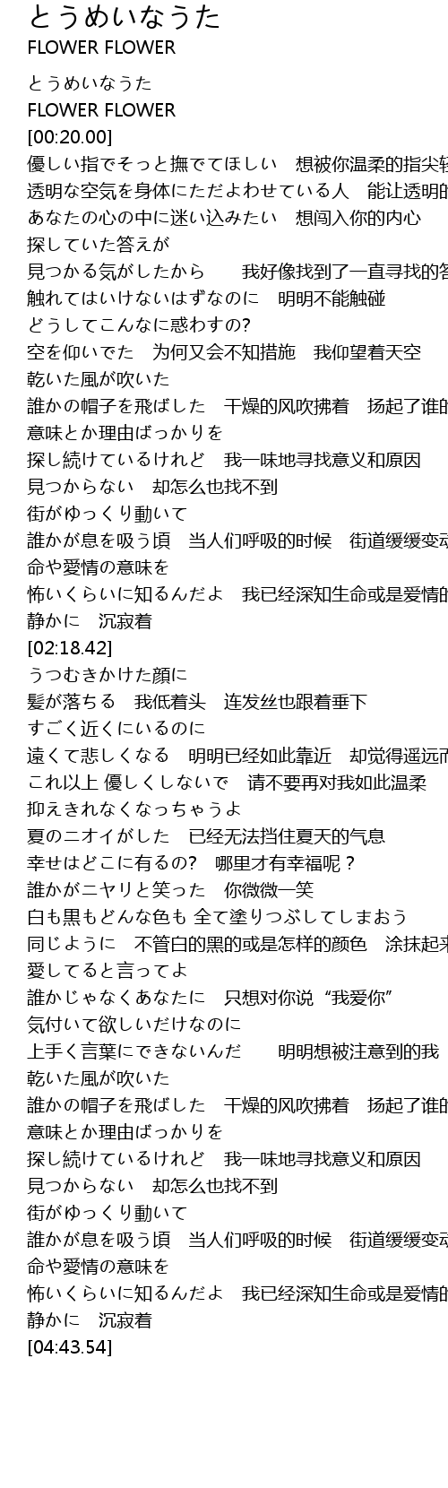 | [04:07.10] | 意味とか理由ばっかりを 探し続けているけれど 我一味地寻找意义和原因 |