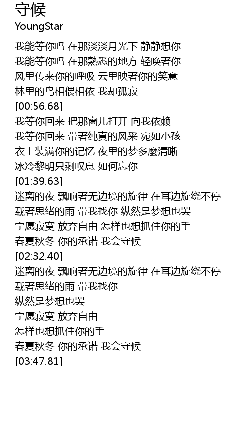 | [02:16.96] | 春夏秋冬 你的承诺 我会守候 |