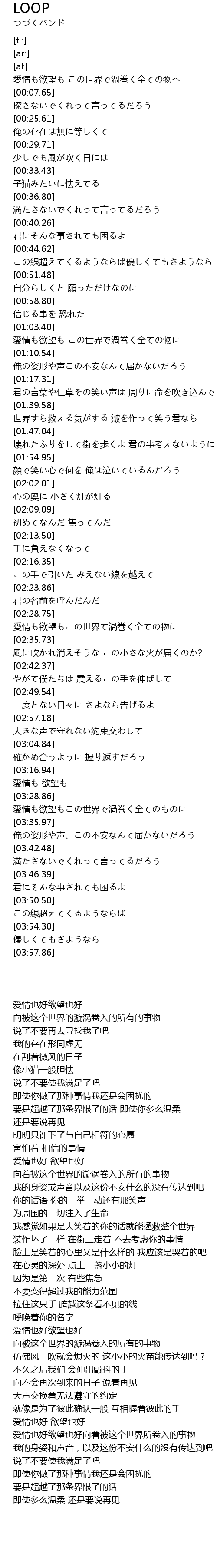 | [01:03.64] | ài qíng yù wàng shì jiè wō juàn quán wù |
