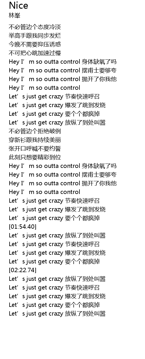 | [01:38.19] | Let’s just get crazy 节奏快速呼召 |