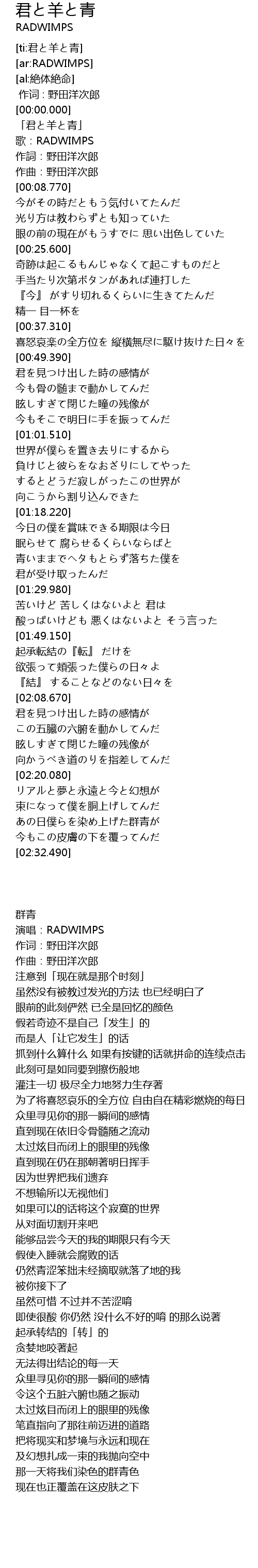 | [00:00.00] | 作词 : 野田洋次郎 |
