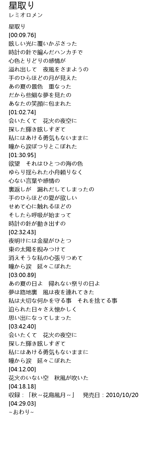 | [04:13.51] | 花火のいない空 秋風が吹いた |
