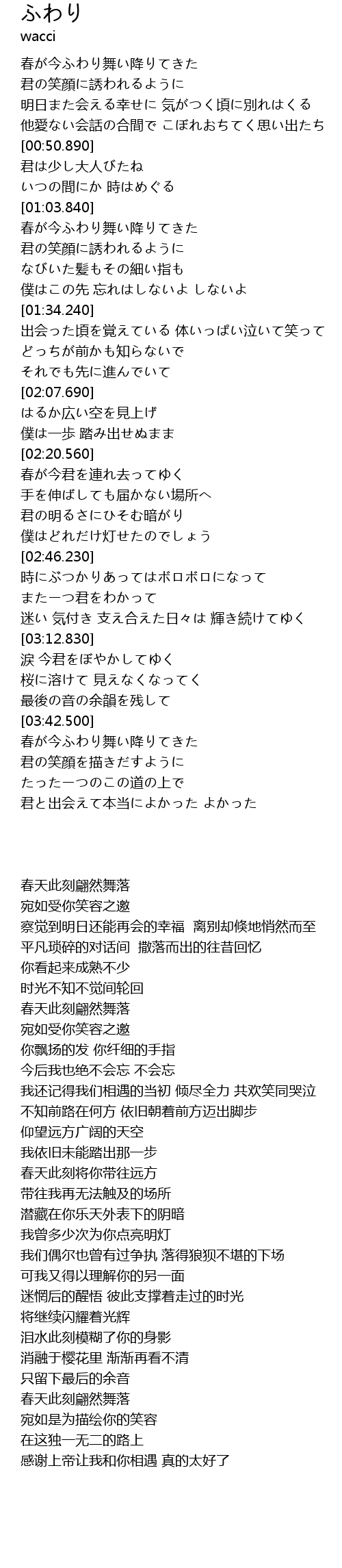 | [03:44.140] | 春が今ふわり舞い降りてきた |