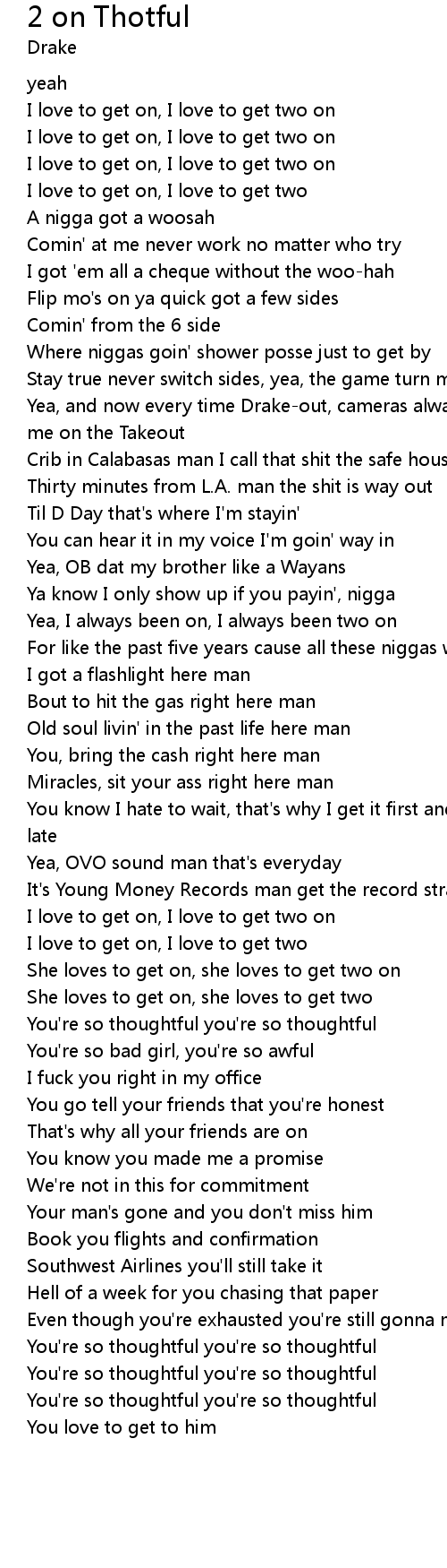 | [00:38.116] | Yea, and now every time Drake-out, cameras always flashing tryna put me on the Takeout |