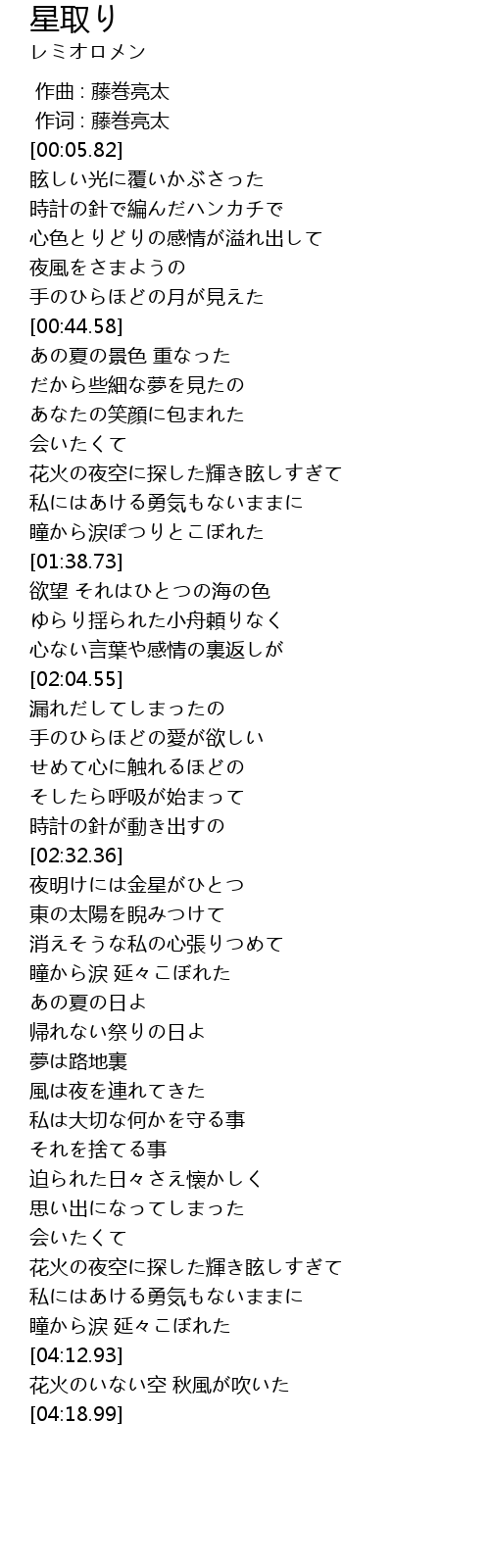 | [04:14.39] | 花火のいない空 秋風が吹いた |