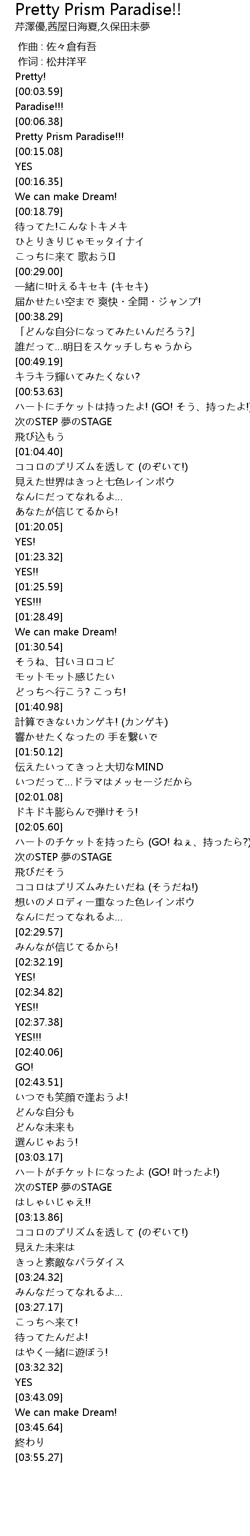 | [00:06.31] | Pretty Prism Paradise!!! |