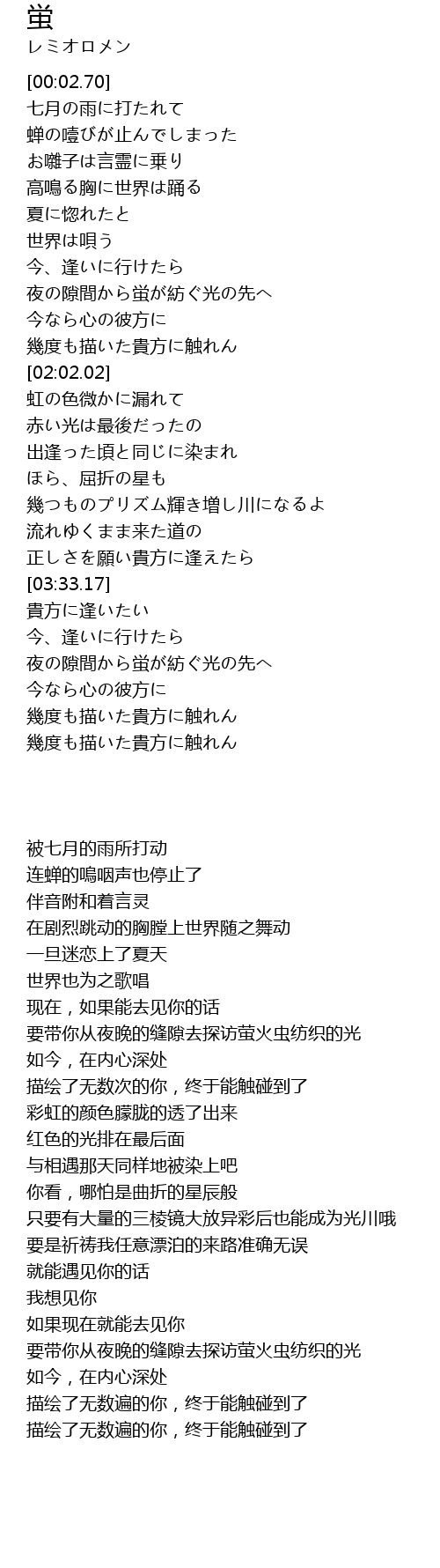 | [04:04.68] | 夜の隙間から蛍が紡ぐ光の先へ |