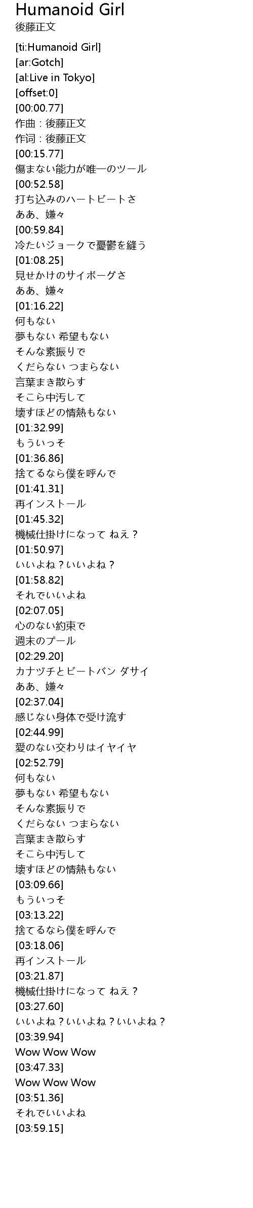 | [03:22.99] | 機械仕掛けになって ねえ? |