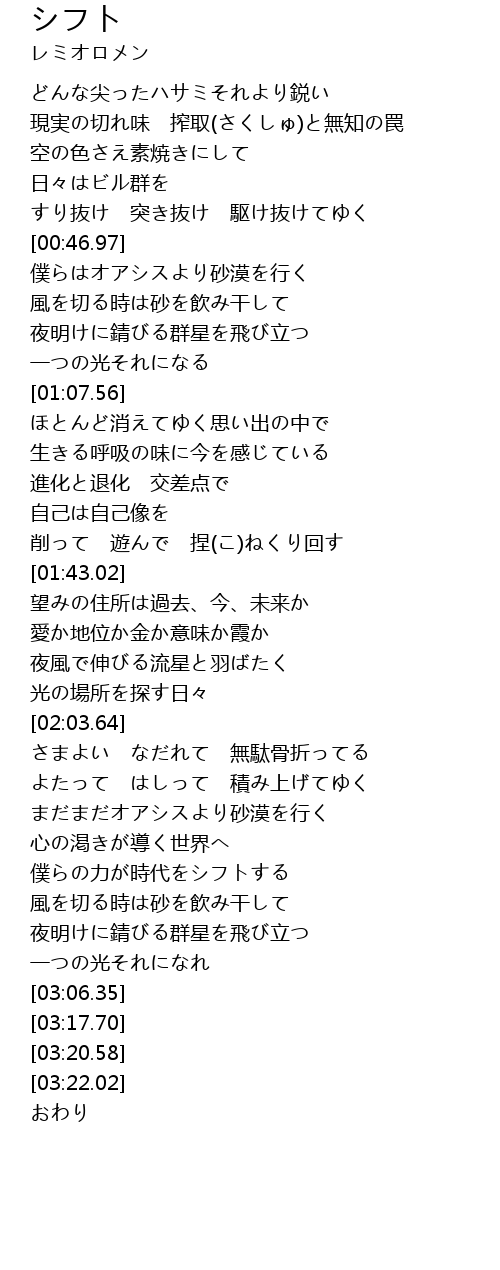 | [00:47.37] | 僕らはオアシスより砂漠を行く |