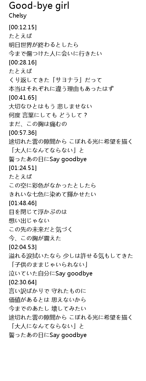 | [02:23.96] | 泣いていた自分にSay goodbye |