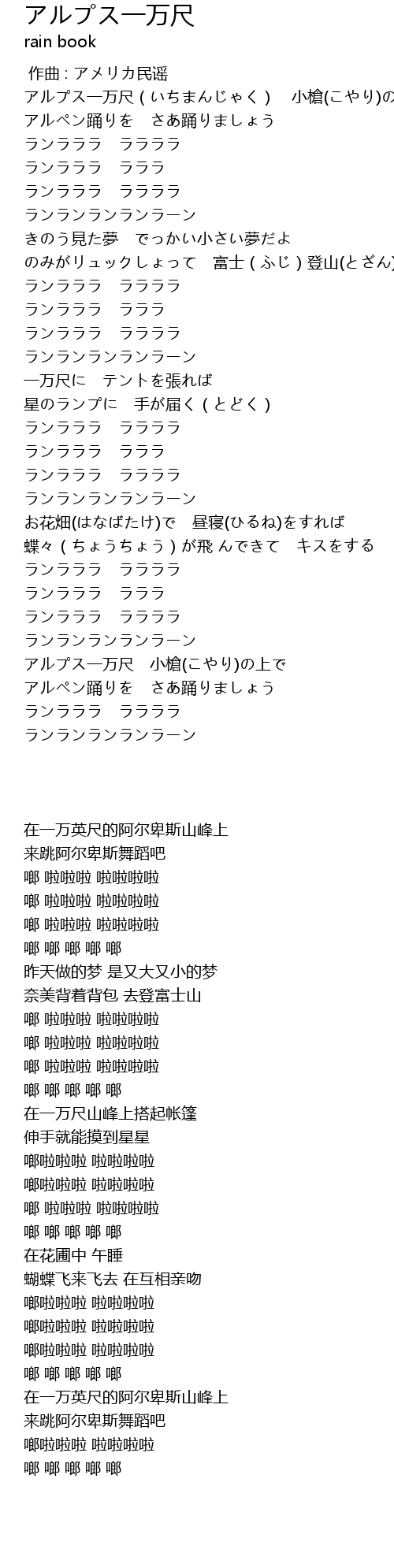 | [00:33.41] | アルプス一万尺(いちまんじゃく) 小槍(こやり)の上で |