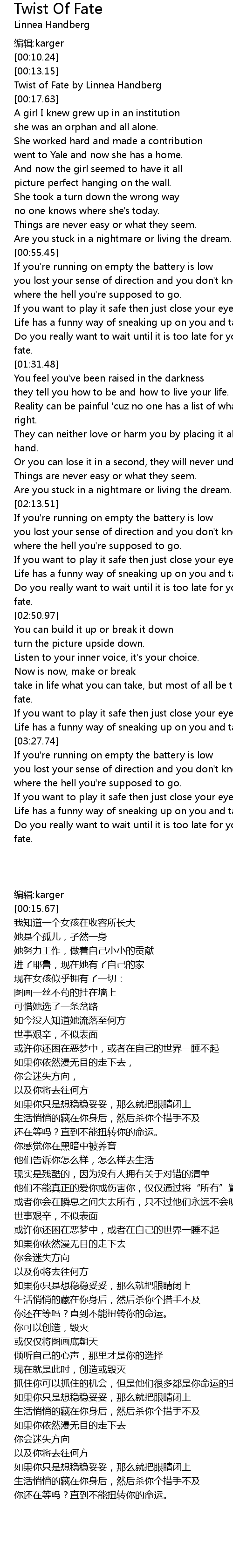| [00:15.67] | Twist of Fate by Linnea Handberg |