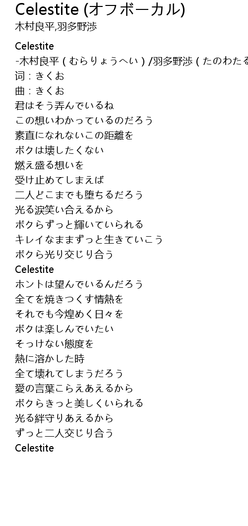 | [00:00.00] | Celestite -木村良平(むらりょうへい)/羽多野渉(たのわたる) |