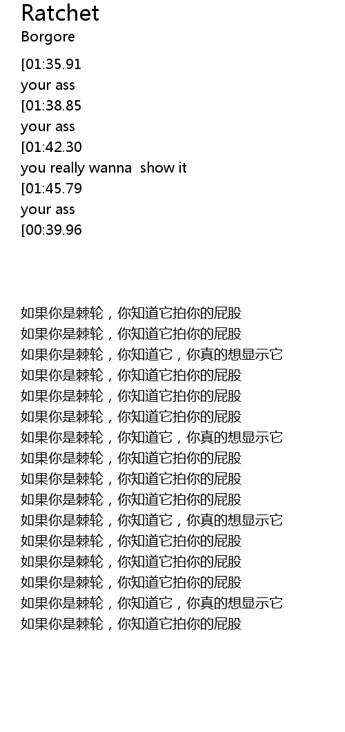 | [01:59.48][01:45.79][00:37.19][00:23.61] | If you're ratchet and you know it clap your ass |