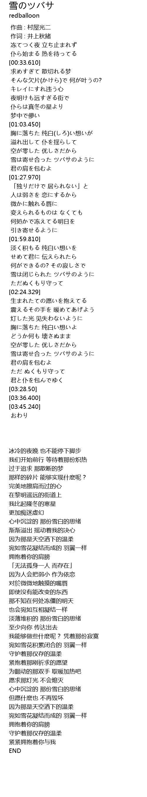 | [03:01.920] | 雪は寄せ合った ツバサのように |