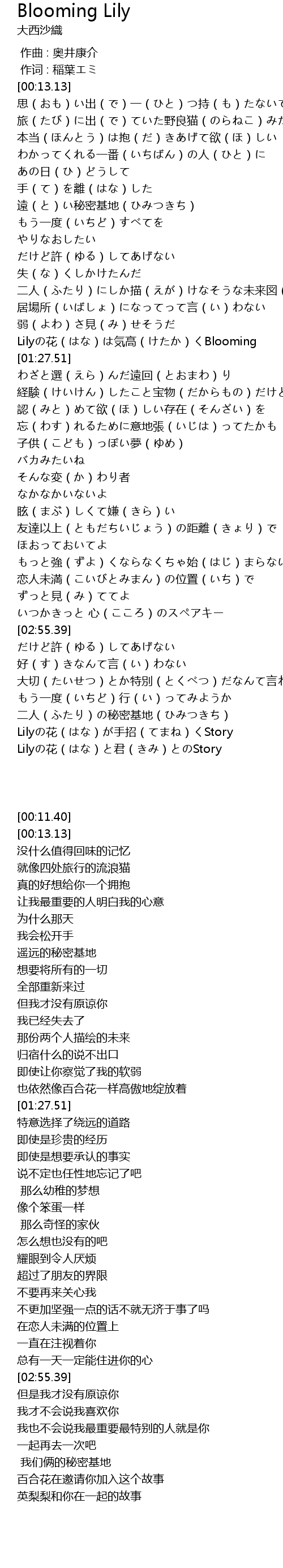 | [01:18.91] | Lily huā qì gāo Blooming |