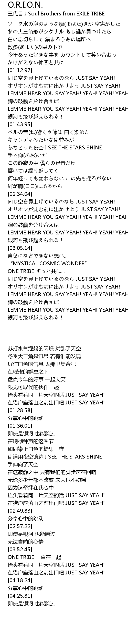 | [01:21.04] | オリオンが沈む前に出かけよう JUST SAY YEAH! |