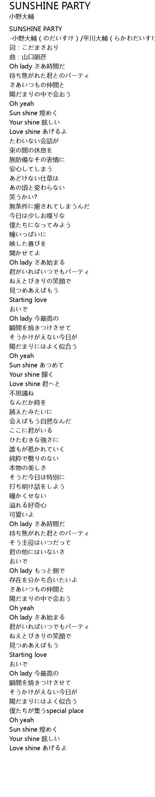 | [00:00.00] | SUNSHINE PARTY -小野大輔(のだいすけ)/平川大輔(らかわだいすけ) |