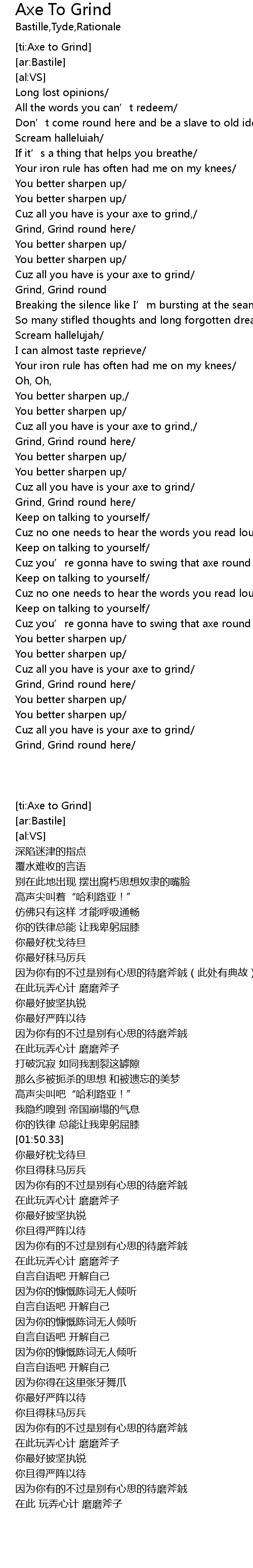 | [02:19.79] | Cuz all you have is your axe to grind/ |