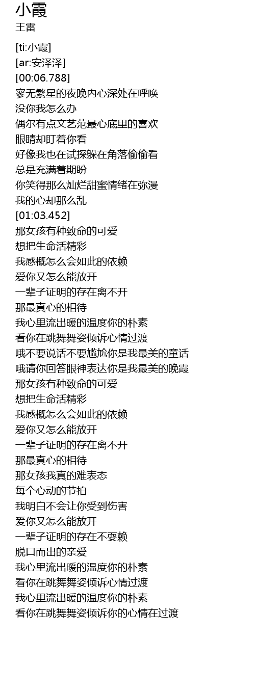 | [01:55.601] | ó qǐng nǐ huí dá yǎn shén biǎo dá nǐ shì wǒ zuì měi dí wǎn xiá |