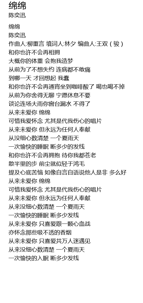 | [00:12.00] | 作曲人:柳重言 填词人:林夕 编曲人:王双(骏) |