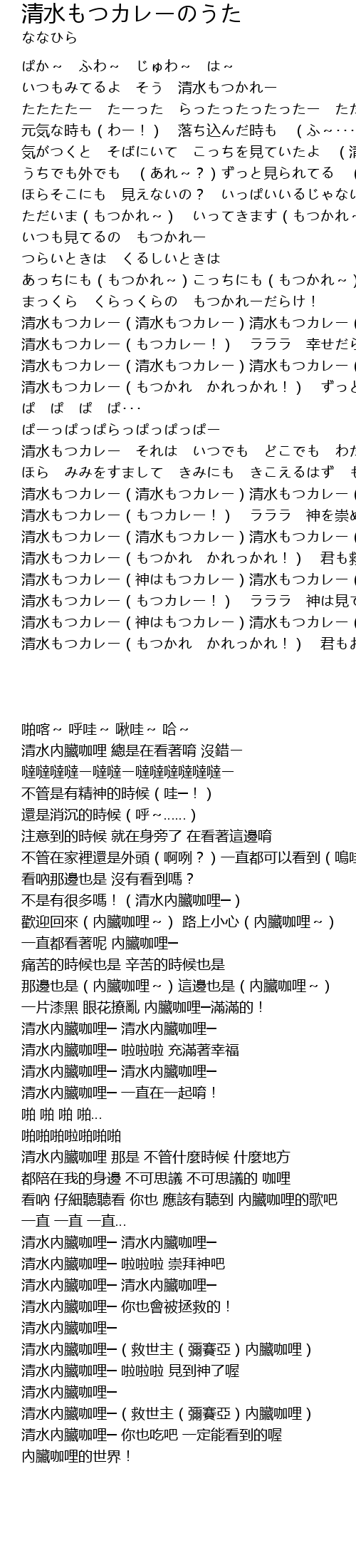 | [03:30.86] | 清水もつカレー(もつかれ かれっかれ!) 君もお食べよ きっと見えるよ もつカレーの世界! |