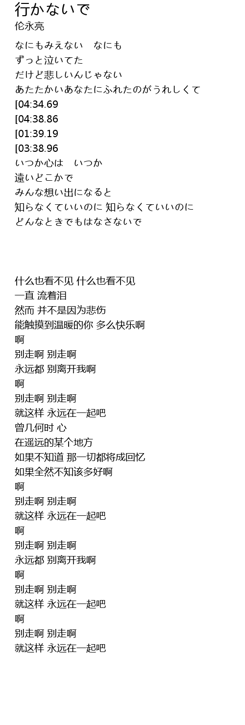 | [05:02.82][04:38.86][03:26.83][03:02.83][01:50.68][01:26.79] | 行かないで 行かないで |