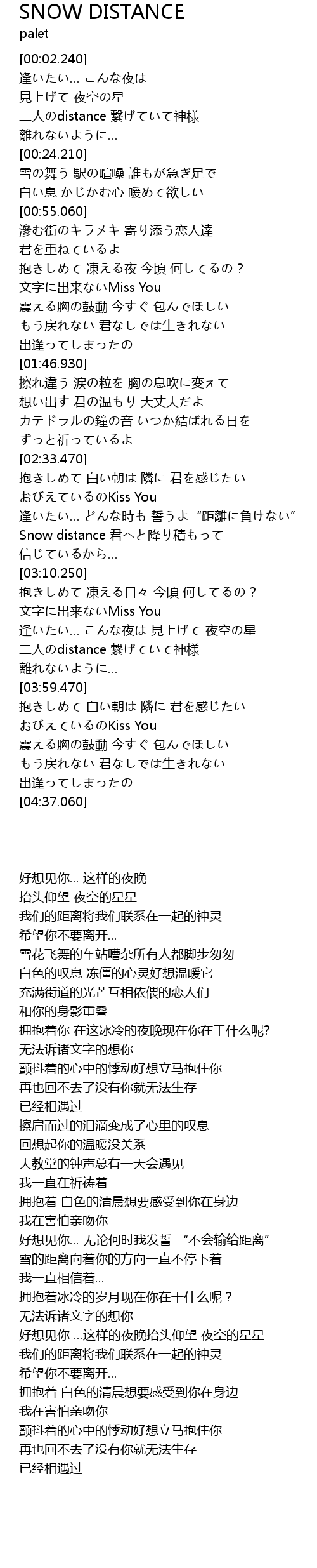 | [02:57.870] | Snow distance 君へと降り積もって |
