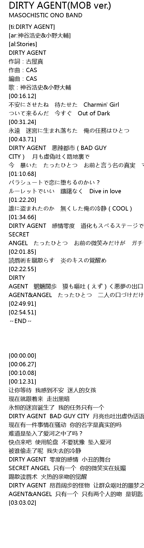 | [02:36.36] | AGENT&ANGEL たったひとつ 二人の口づけだけが カギさ |