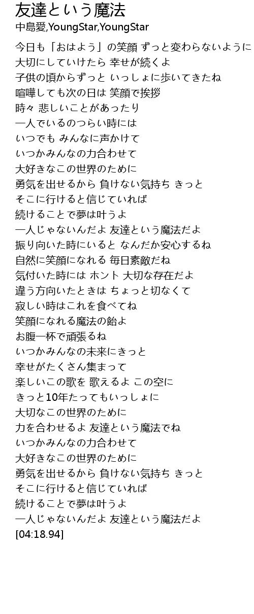 | [04:07.10] | 一人じゃないんだよ 友達という魔法だよ |