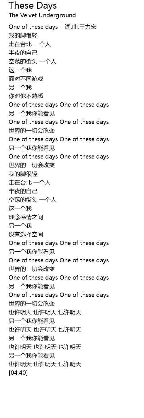 | [00:00] | One of these days 词,曲:王力宏 |