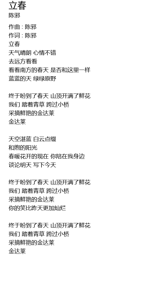 | zhōng yú pàn dào le chūn tiān shān dǐng kāi mǎn le xiān huā | |