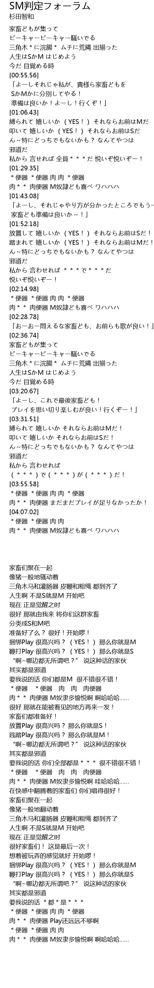 | [02:20.69] | 肉** 肉便器 M奴隷ども喜べ ワハハハ |
