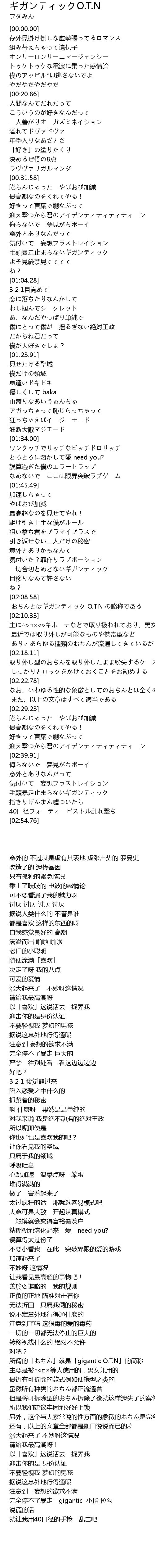 | [02:08.81] | おちんとはギガンティック O.T.N の略称である |