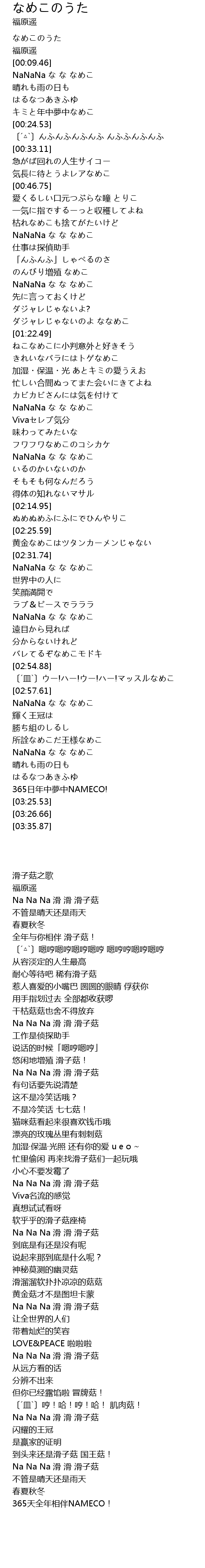 | [01:19.34] | ダジャレじゃないのよ ななめこ |