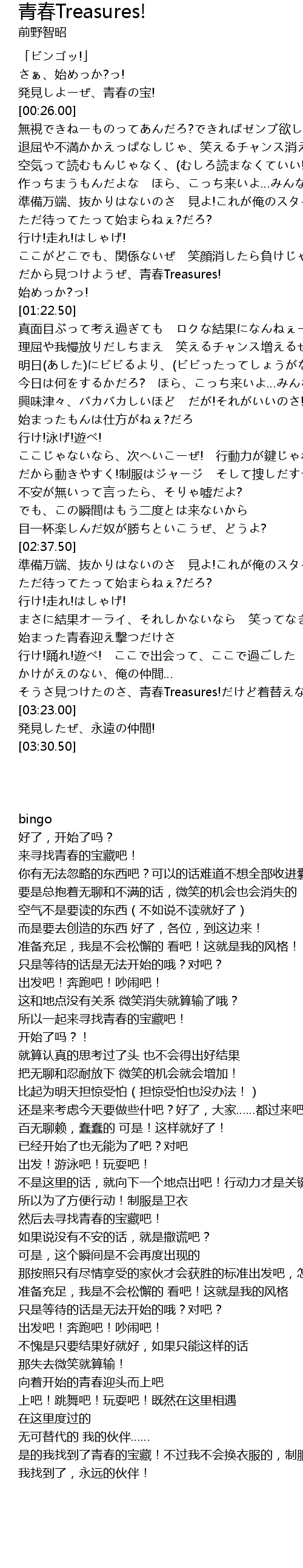 | [01:13.50] | だから見つけようぜ、青春Treasures! |