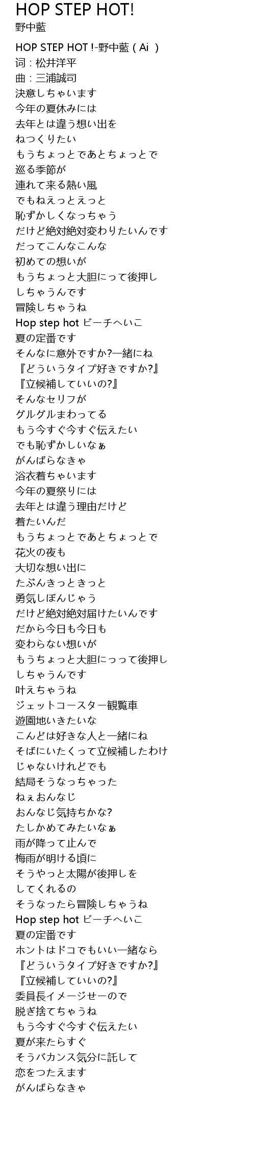 | [00:00.00] | HOP STEP HOT !-野中藍(Ai ) |