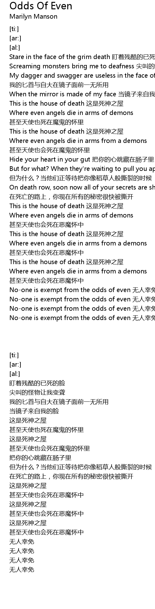 | [05:02.24] | No-one is exempt from the odds of even 无人幸免 |