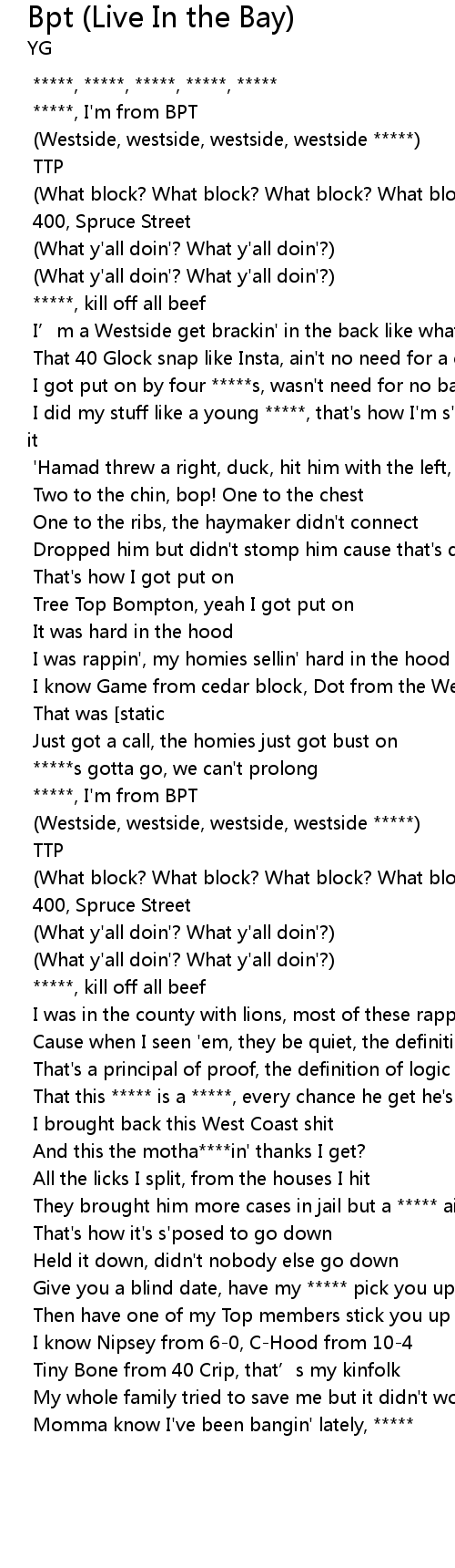 | [01:35.480] | That this ***** is a *****, every chance he get he's dodgin' |