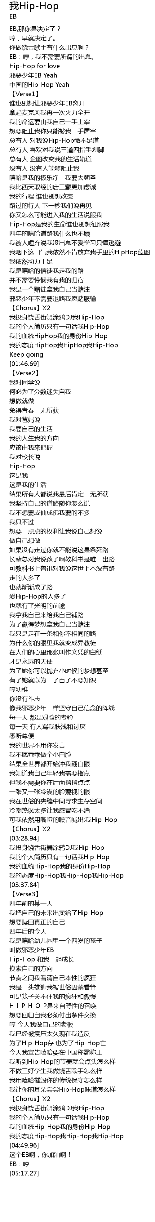 | [03:23.27] | 可我依然用嘶哑的嗓音喊出:我Hip-Hop |