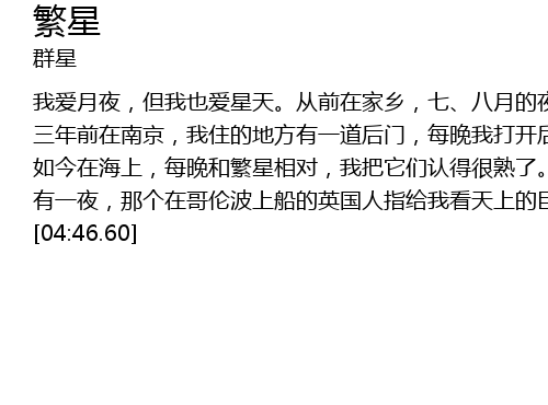 | [00:01.42] | 我爱月夜,但我也爱星天。从前在家乡,七、八月的夜晚,在庭院里纳凉的时候,我最爱看天上密密麻麻的繁星。望着星天,我就会忘记一切,仿佛回到了母亲的怀里似的。 |