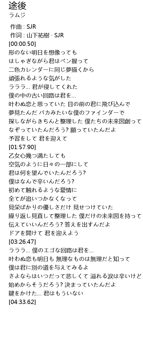 | [03:00.33] | 繰り返し見直して整理した 僕だけの未来図を持って |
