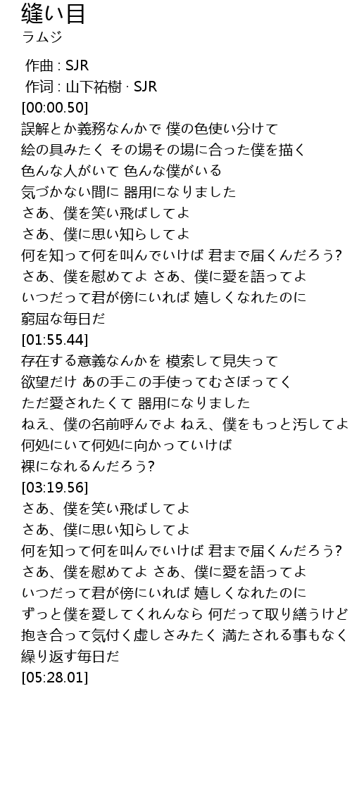 | [03:56.63] | さあ、僕を笑い飛ばしてよ さあ、僕に思い知らしてよ |