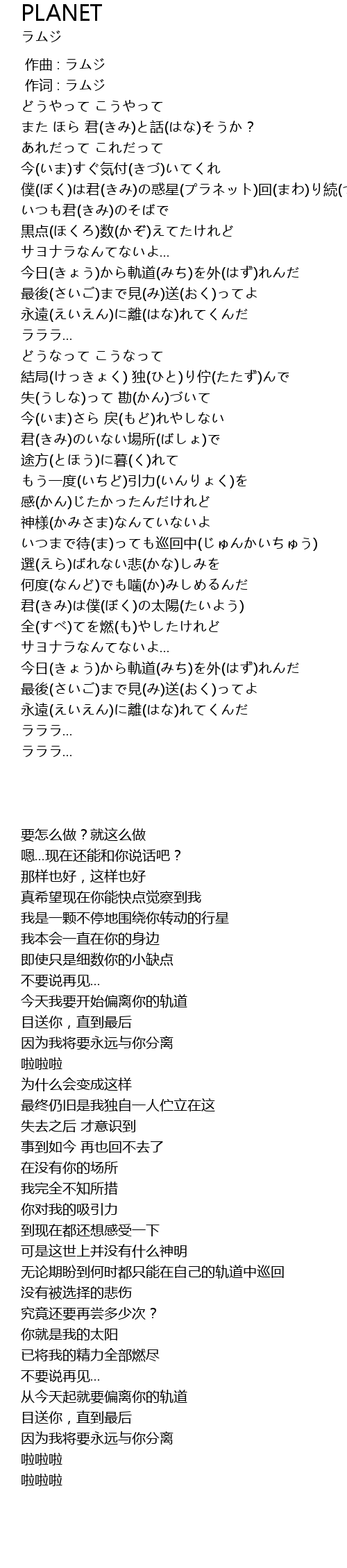 | [00:27.950] | 僕(ぼく)は君(きみ)の惑星(プラネット)回(まわ)り続(つづ)けて |