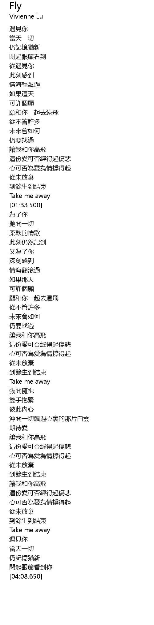 | [00:50.020] | yuàn hé nǐ yì qǐ qù yuǎn fēi |