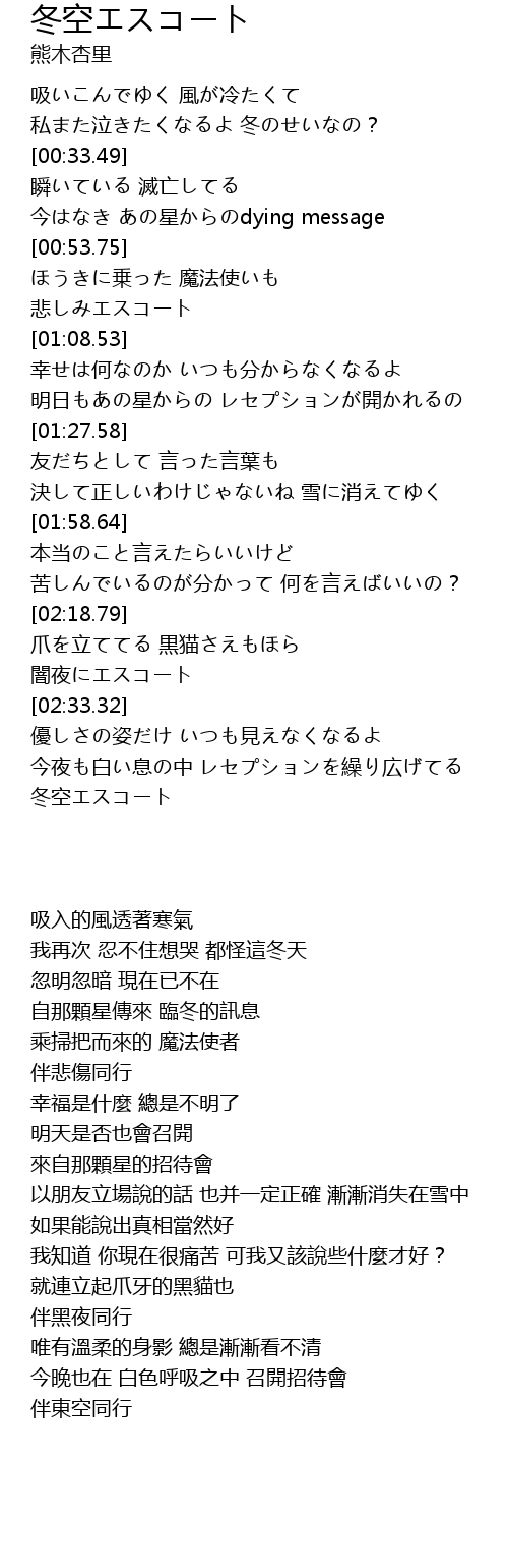 | [00:26.72] | 私また泣きたくなるよ 冬のせいなの? |