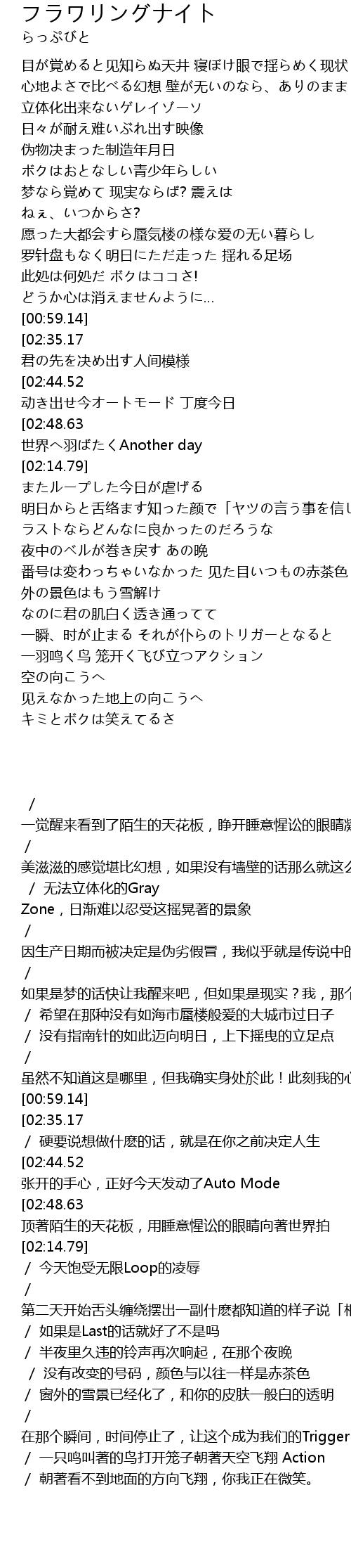 | [03:07.28][02:48.63][02:09.03][01:13.03] | 见知らぬ天井 寝ぼけ眼で 世界へ羽ばたくAnother day |